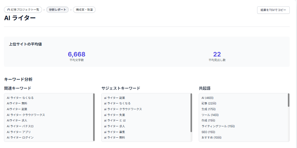キーワード分析から構成案作成、記事作成、リライト、分析まで一貫したサービスを提供しています。