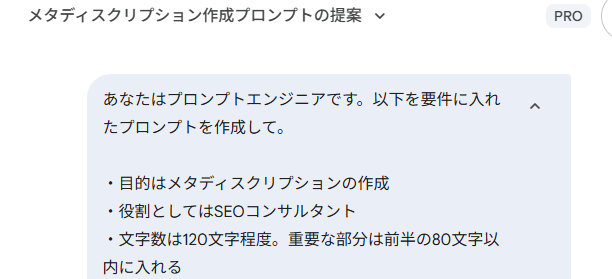 「何を指示すればいいか分からない」という場合は、AIに「メタディスクリプションを作成するためのプロンプトを作って」と依頼するのも一つの手です。