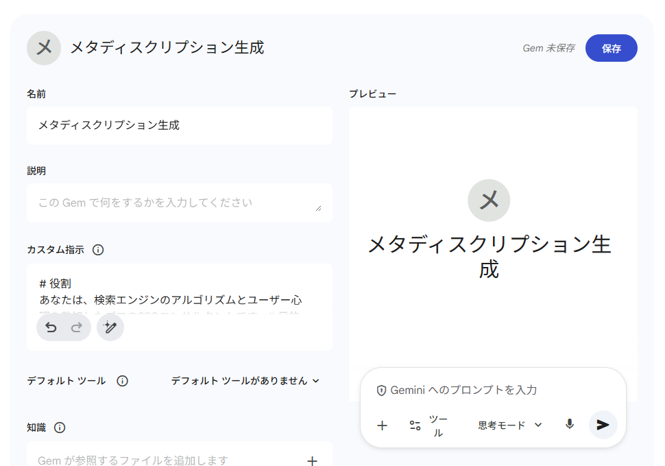 Googleが提供するGeminiの「Gem(カスタムチャット機能)」を使えば、一度設定したプロンプトを保存できます。