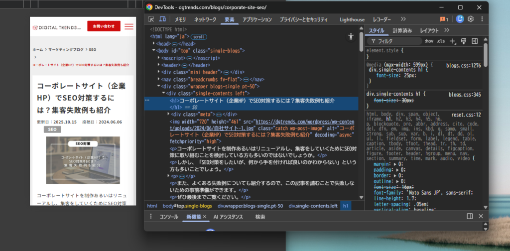 確認したいページを開き、右クリックして「ページのソースを表示」を選択するか、F12キー(MacはCmd + Option + I)でデベロッパーツールを起動します。