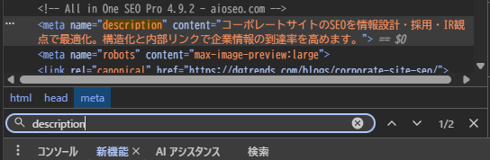 ソースコードが表示されたら、Ctrl + F(MacはCmd + F)で検索窓を出し、「description」と入力してください。の「content」部分に書かれているのが、そのページのメタディスクリプションです。