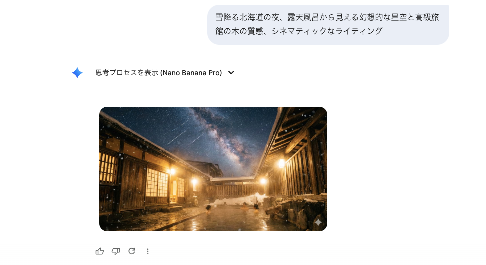 単に「温泉」と入力するのではなく、SEOキーワード(北海道、雪、高級感、プライベート)をプロンプトに盛り込みます。