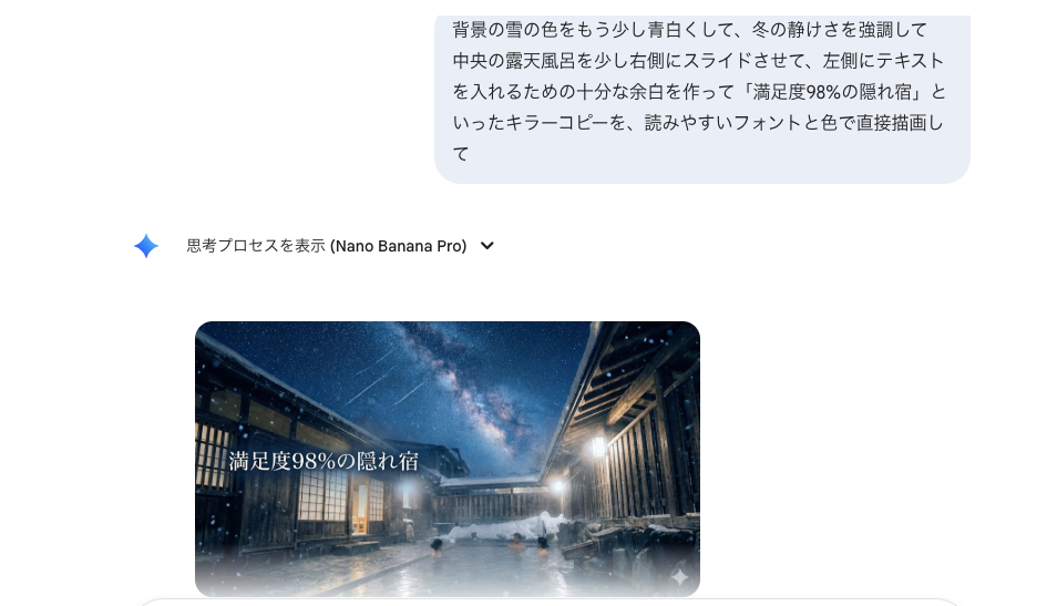 ・高精度な文字入れ: 確保した余白に「満足度98%の隠れ宿」というキラーコピーを、読みやすいフォントと色で直接描画させます。