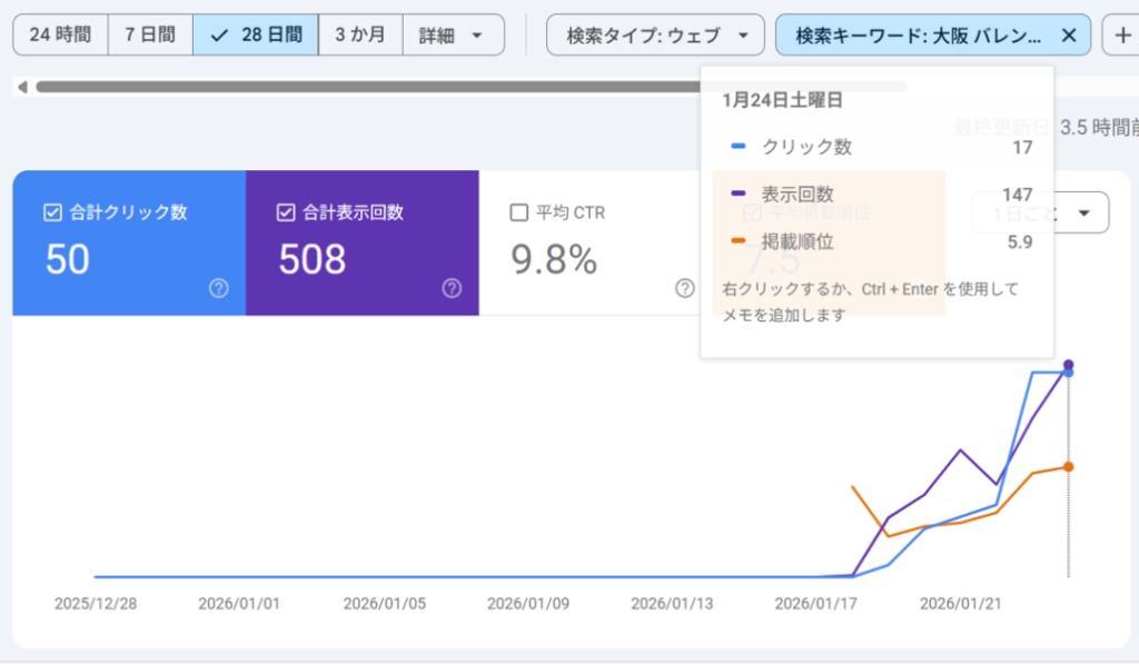 上記の画像は、弊社のAIライティングツールである「デジライト」を使って、記事公開1週間以内に、「大阪 バレンタイン」で掲載順位6位以内に入り、流入を獲得している事例です。