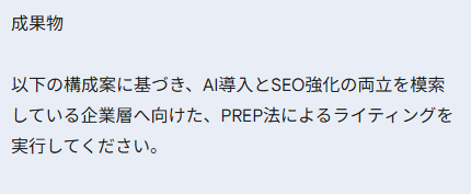 この他にも、見出し構成を事前に作成し、各セクションで何を書くべきかを具体的に指示することで、論理的で読みやすい記事になります。