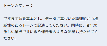 一つ目に、「専門的だが親しみやすく」「初心者にもわかりやすく」「ビジネスライクに」など、トーン&マナーの方向性を指定します。