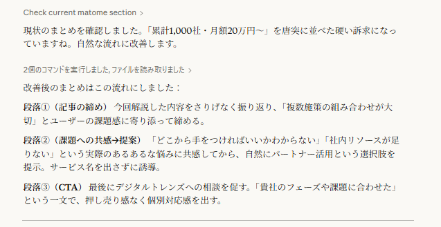 整理した改善点をもとにClaudeに再出力させ、また文章を読んで違和感がないか確認する。このサイクルを2〜3回繰り返すことで、訴求の流れが自然に整っていきます。