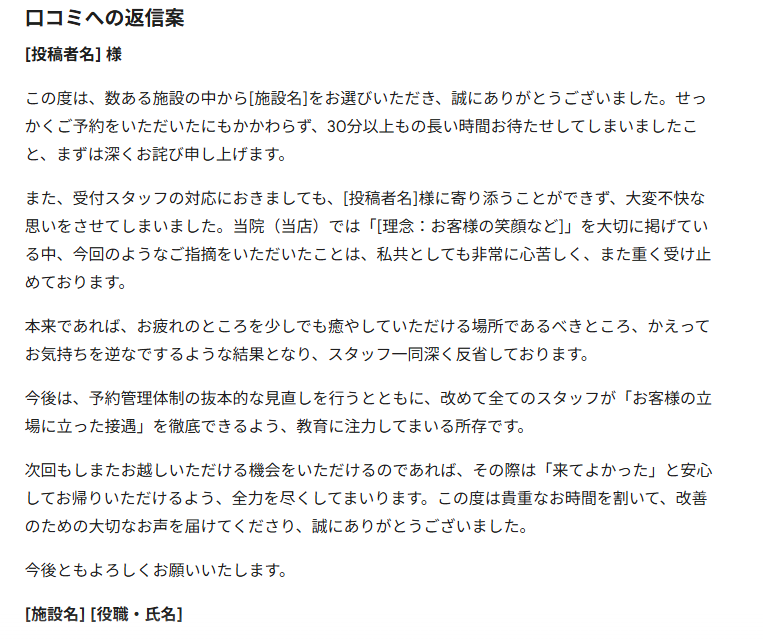 期待(予約)と実態(待ち時間・接客)のギャップによる怒りに対して、言い訳をせず、まずは不快な思いをさせた事実に100%共感する構成にしています。