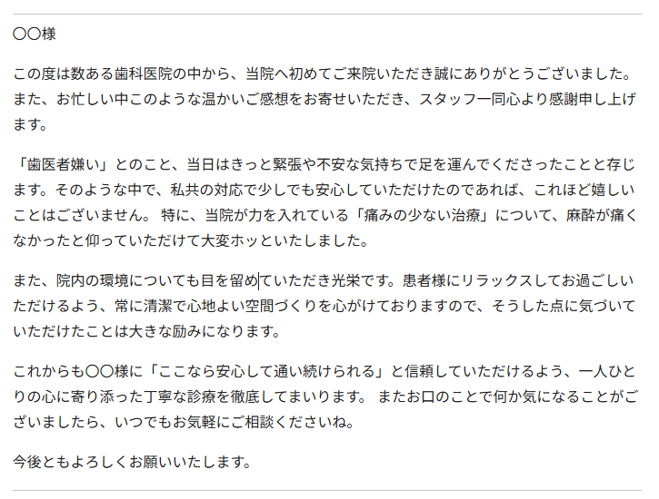 口コミにある「優しさ」「麻酔の痛み」「清潔感」の3点すべてに丁寧に触れ、事務的な印象を与えないよう配慮されています。
